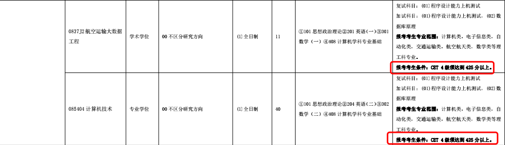 硕士招生专业目录中,多个专业要求四级达到425分及以上。