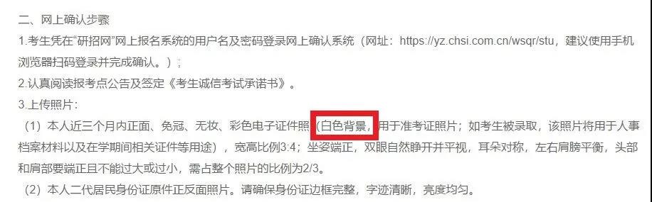 上传人像照片是网上确认的必经环节,研招网有一个统一的照片要求,如果研招网要求和报考点要求不一样,则以报考点的照片要求为准。