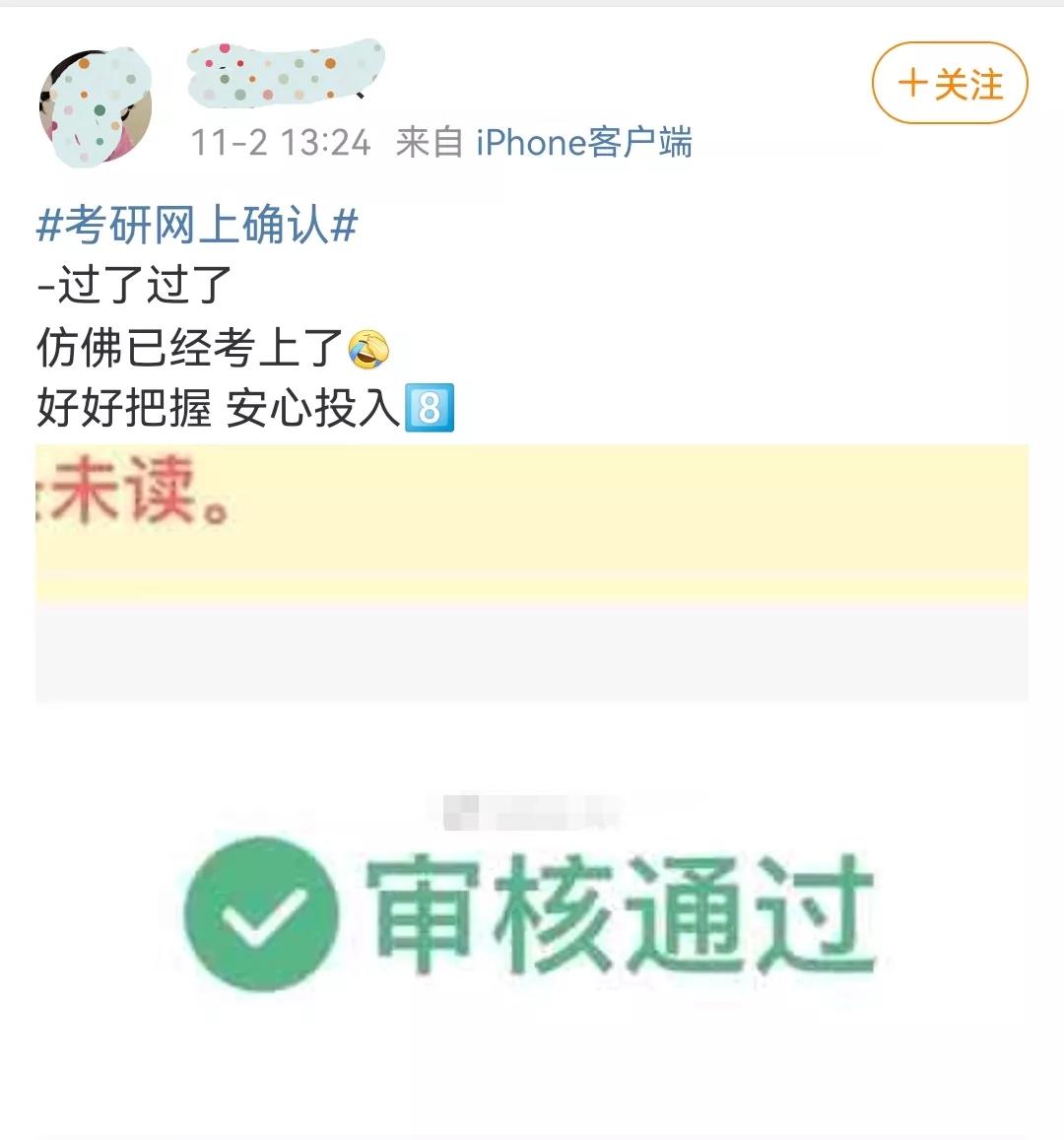 网上确认时间确实就这么几天,大家还是得时刻关注着,毕竟过了就能安心复习,这年头审核过了的感觉跟考上了似的,还是祝大家都能顺利通过啊~