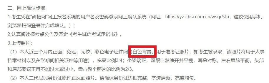 上传人像照片是网上确认的必经环节,研招网有一个统一的照片要求,如果研招网要求和报考点要求不一样,则以报考点的照片要求为准。